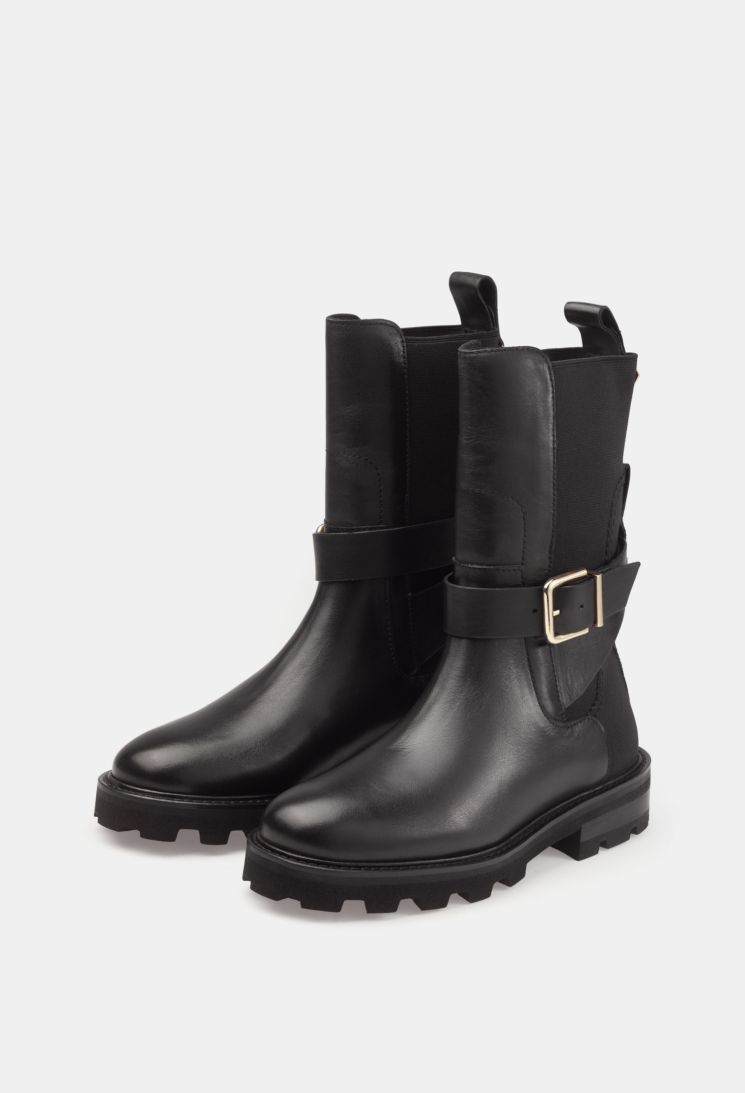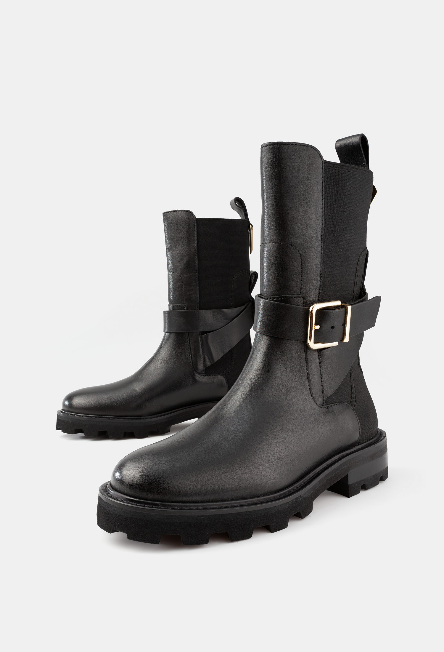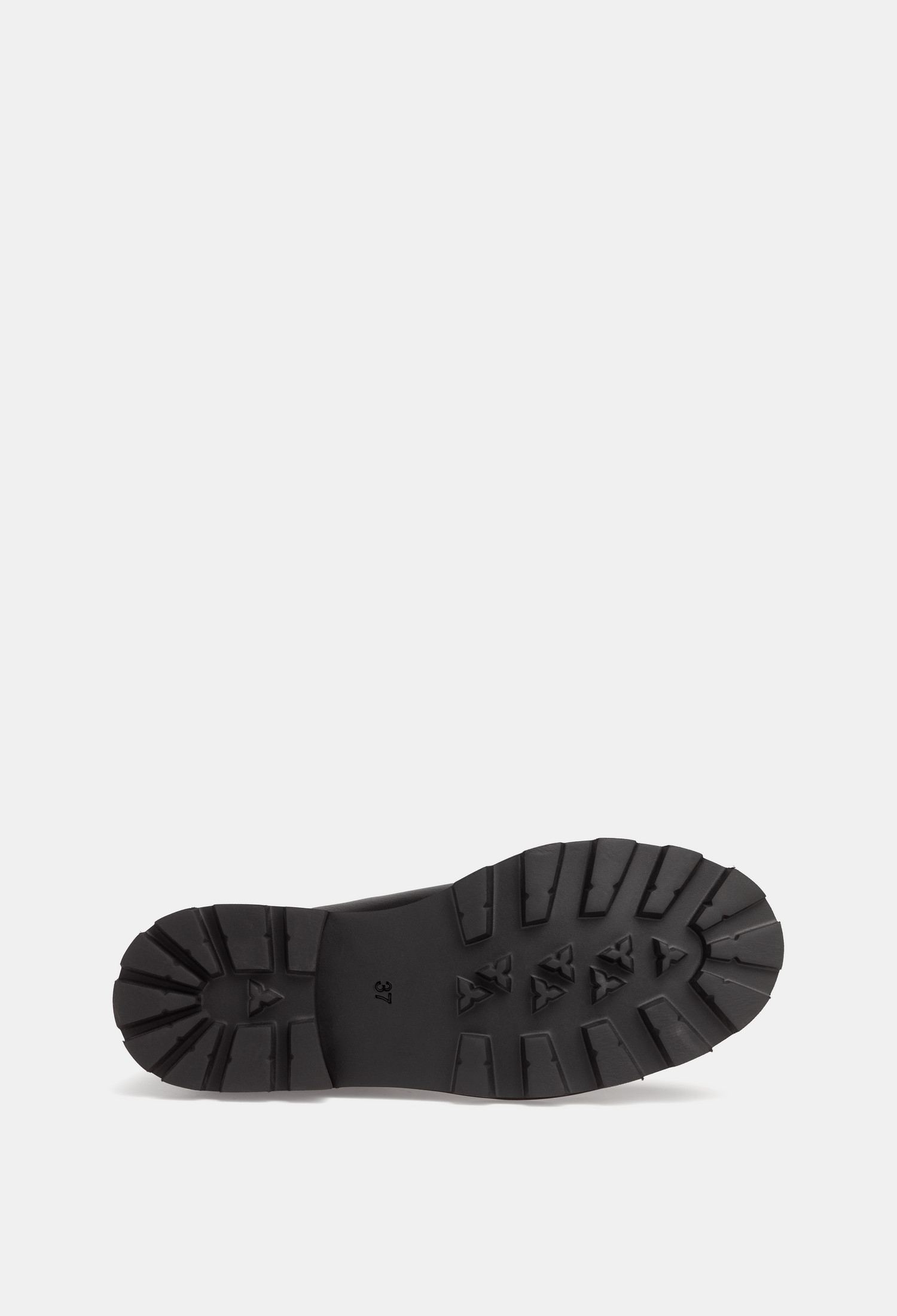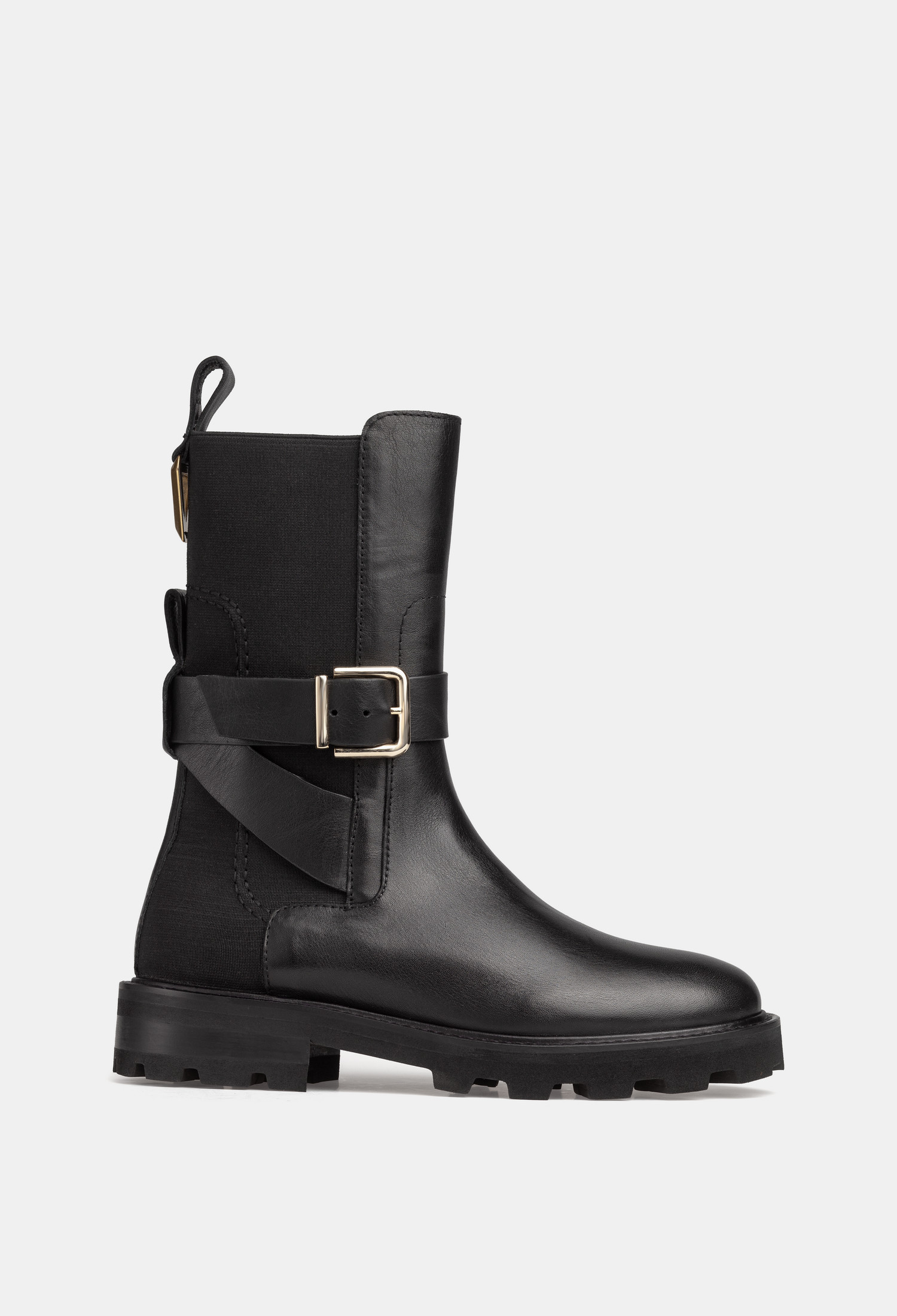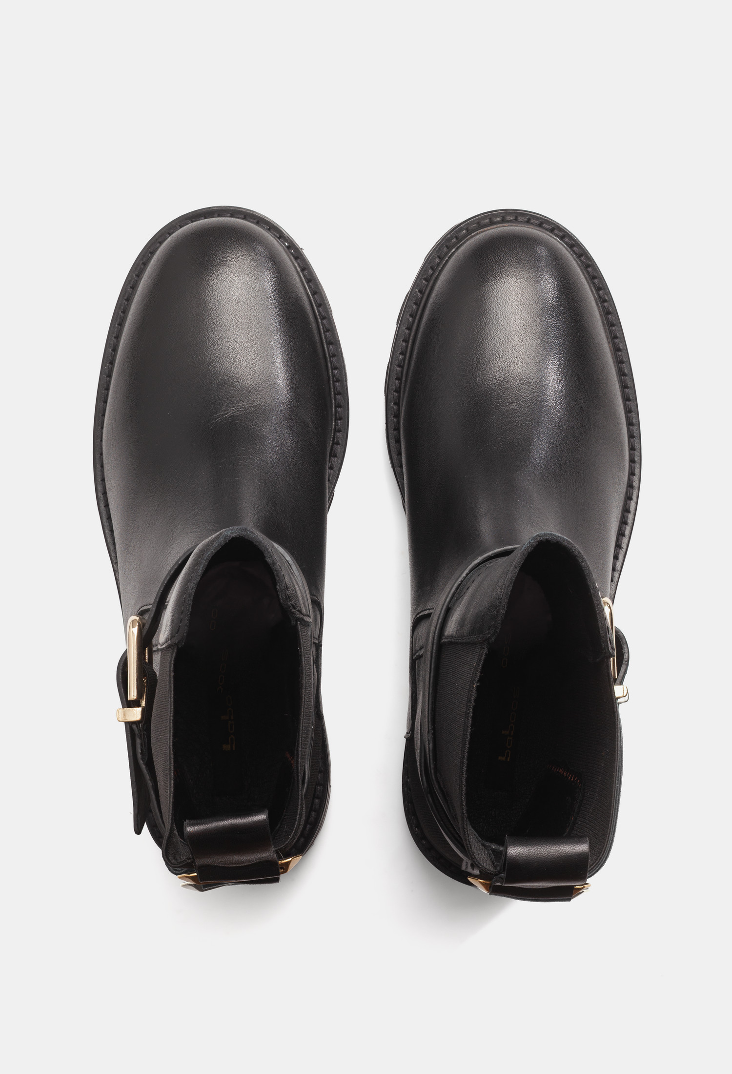 Челси с декоративной пряжкой в чёрной гладкой коже. Высокое голенище из эластичного материала и мягкие ремешки пары обеспечивают правильное и комфортное положение стопы в ботинке. Подошва снабжена надёжным и аккуратным протектором. Такая пара визуально удлиняет ноги, а также прекрасно сочетается как со строгими, так и более расслабленными образами. Обратите внимание, изделие маломерит на один размер.