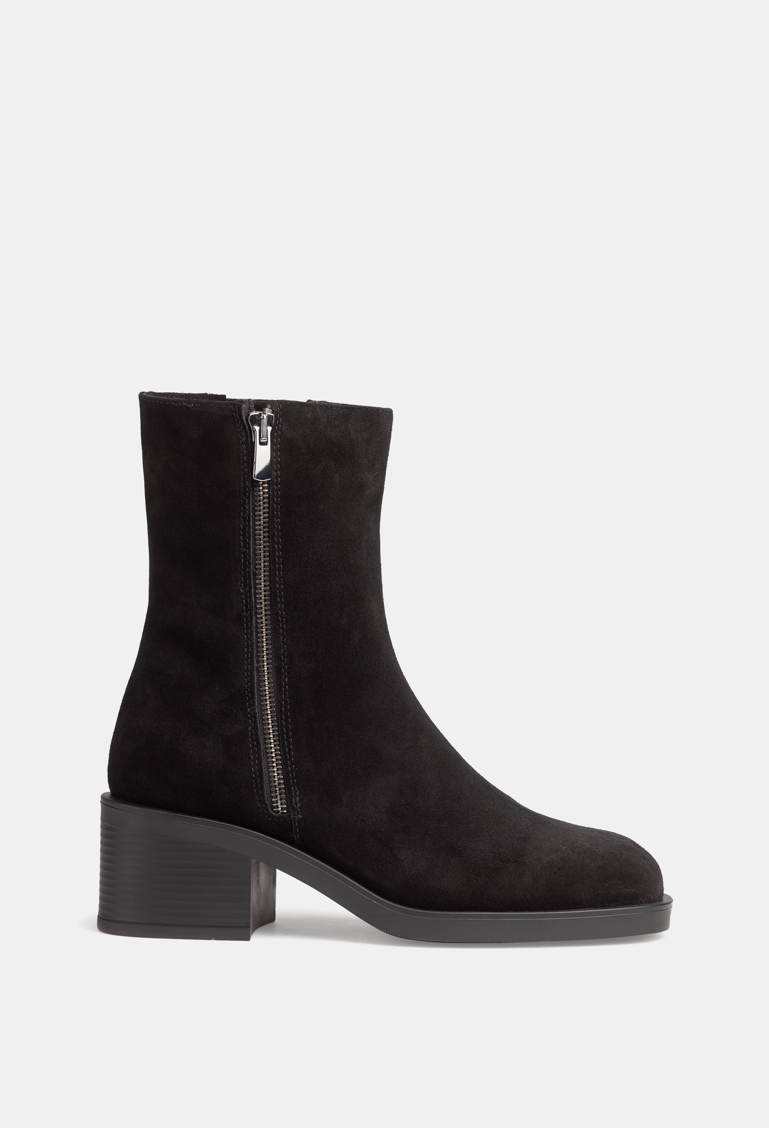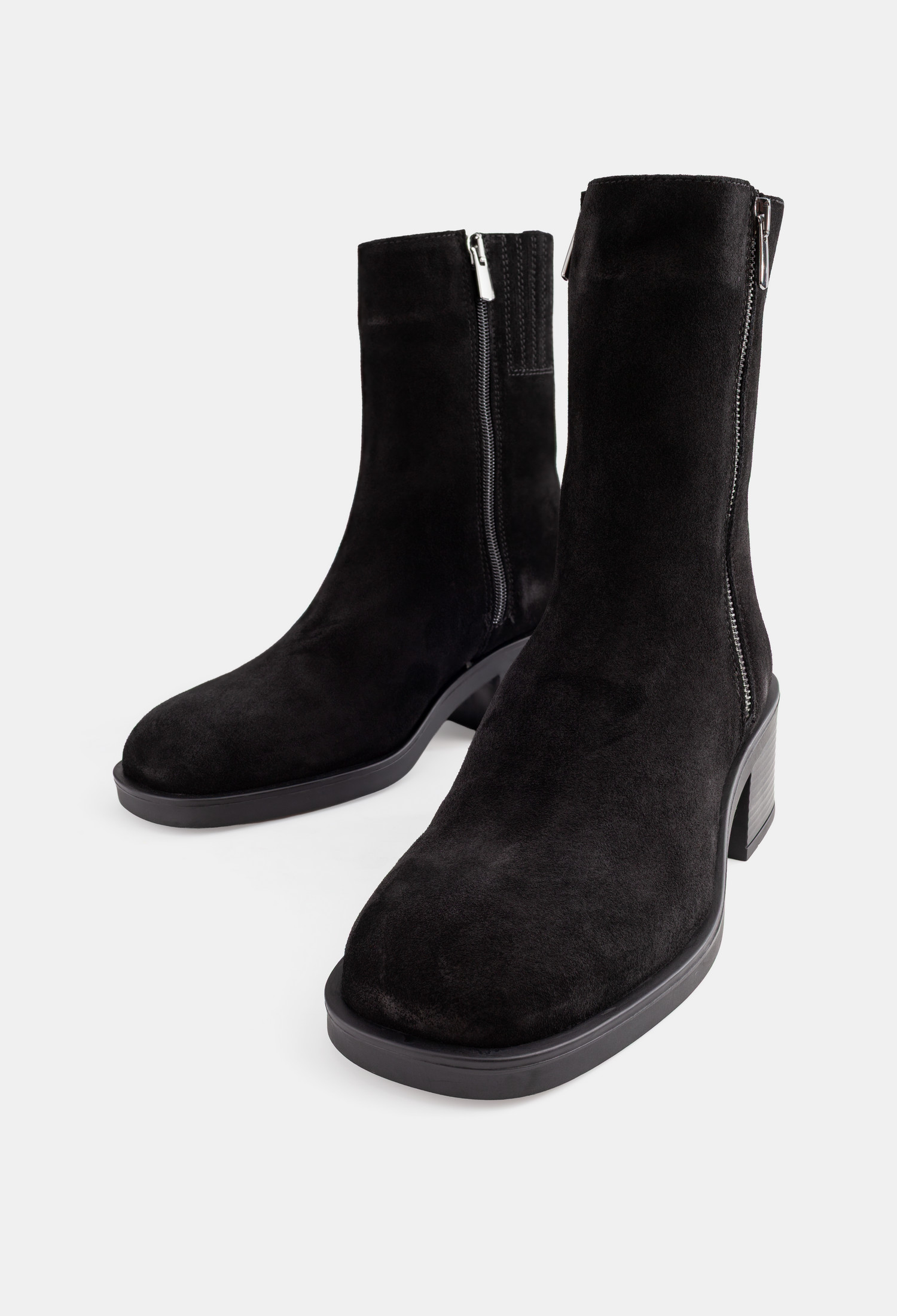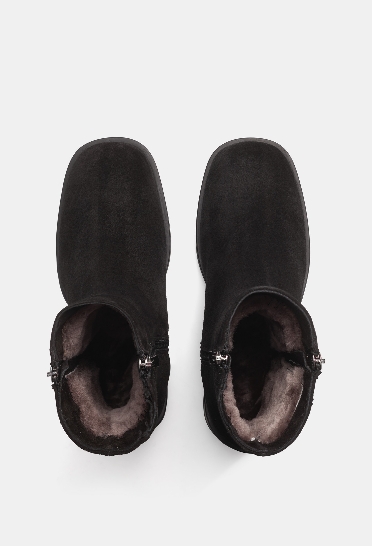 Лаконичные ботильоны с закругленным носом в чёрной замше. Данная модель является элегантным и практичным вариантом для зимнего периода. Пара выполнена из мягкой замши и полностью утеплена изнутри натуральным мехом и имеет целых две молнии по бокам для удобного надевания. Отличительной чертой модели выступает удобный устойчивый каблук высотой 6 см. Обратите внимание, модель маломерит на размер за счёт меха.