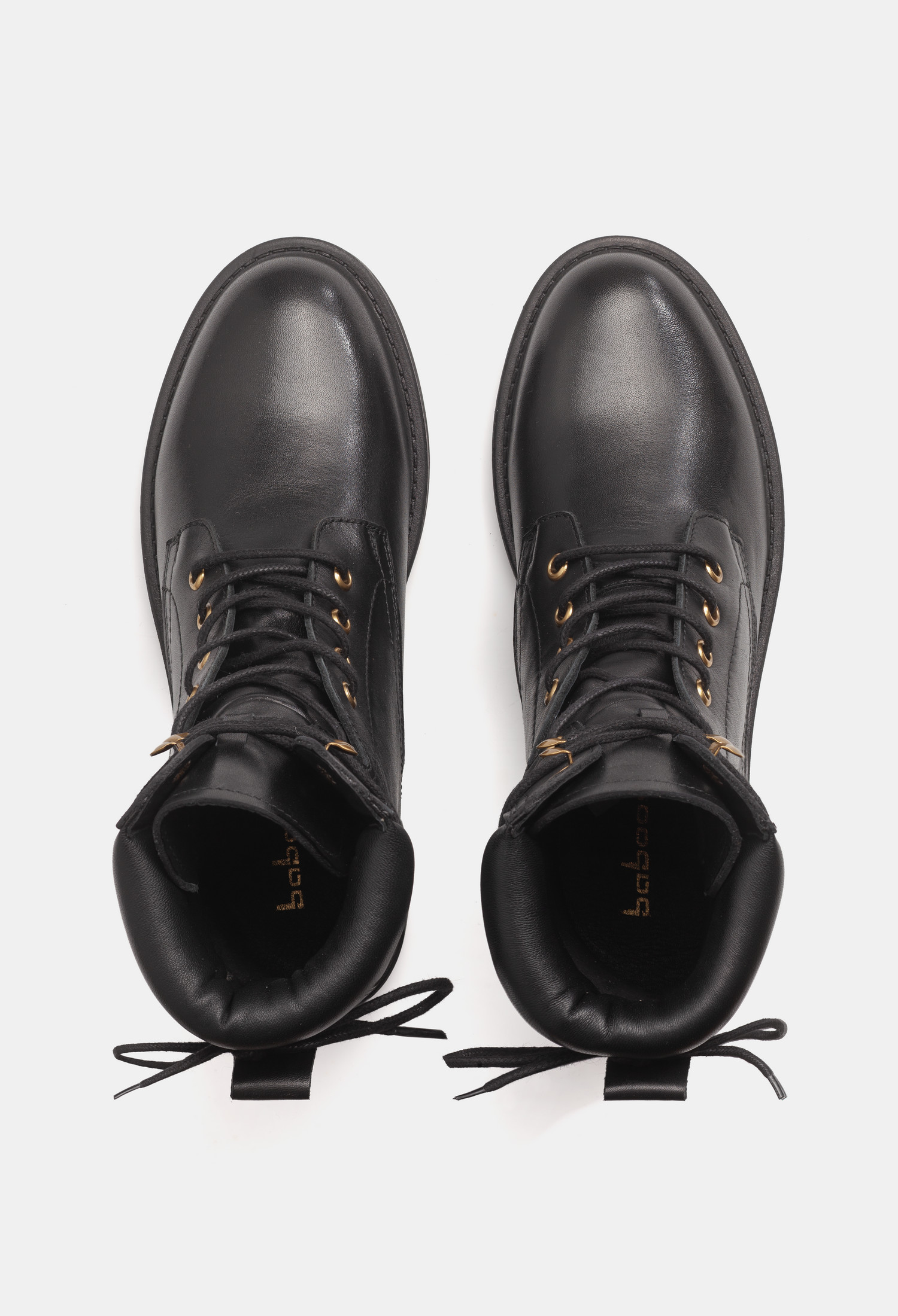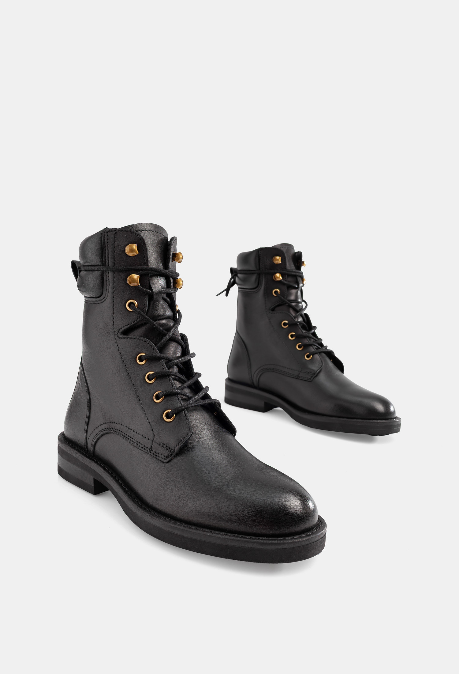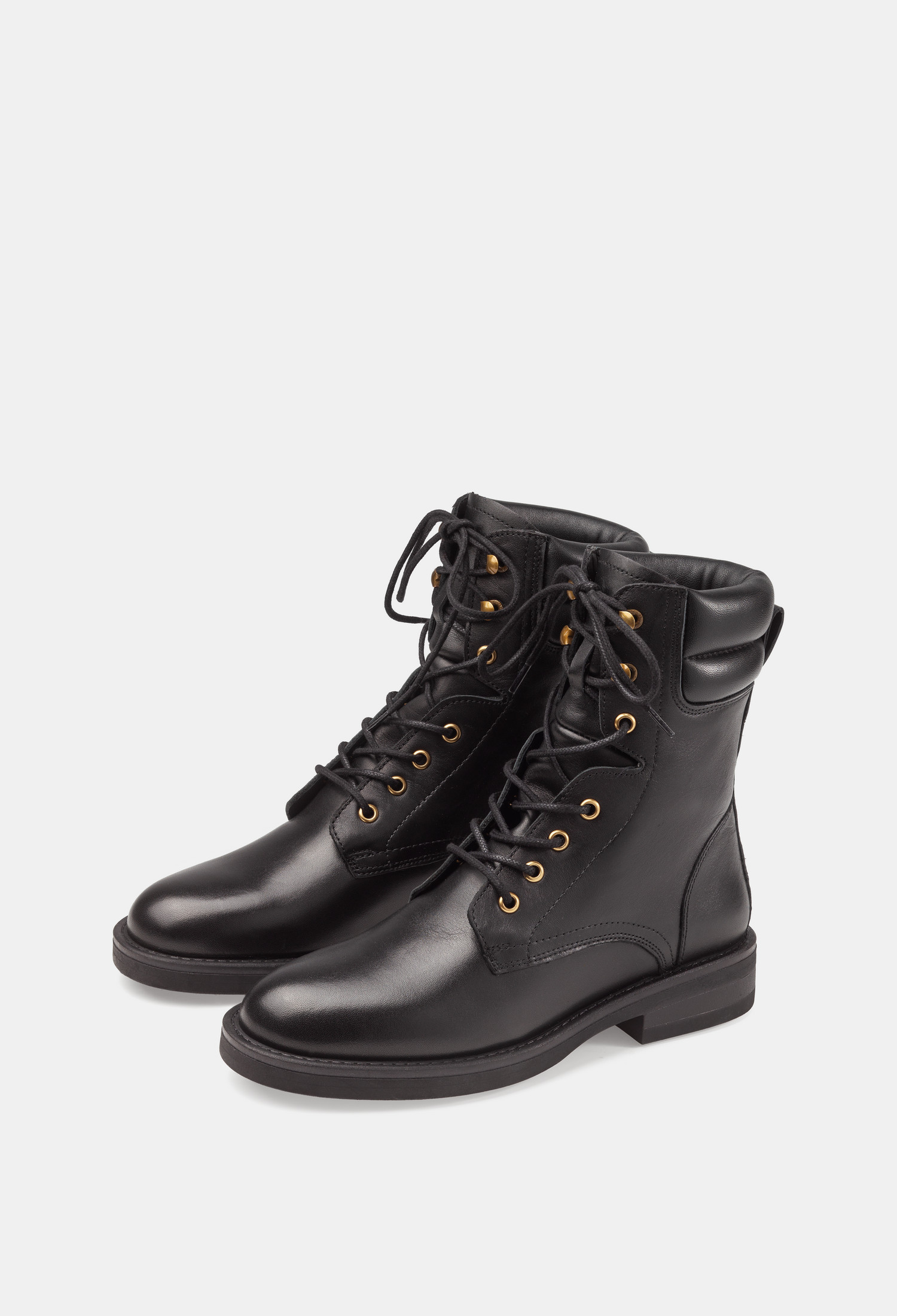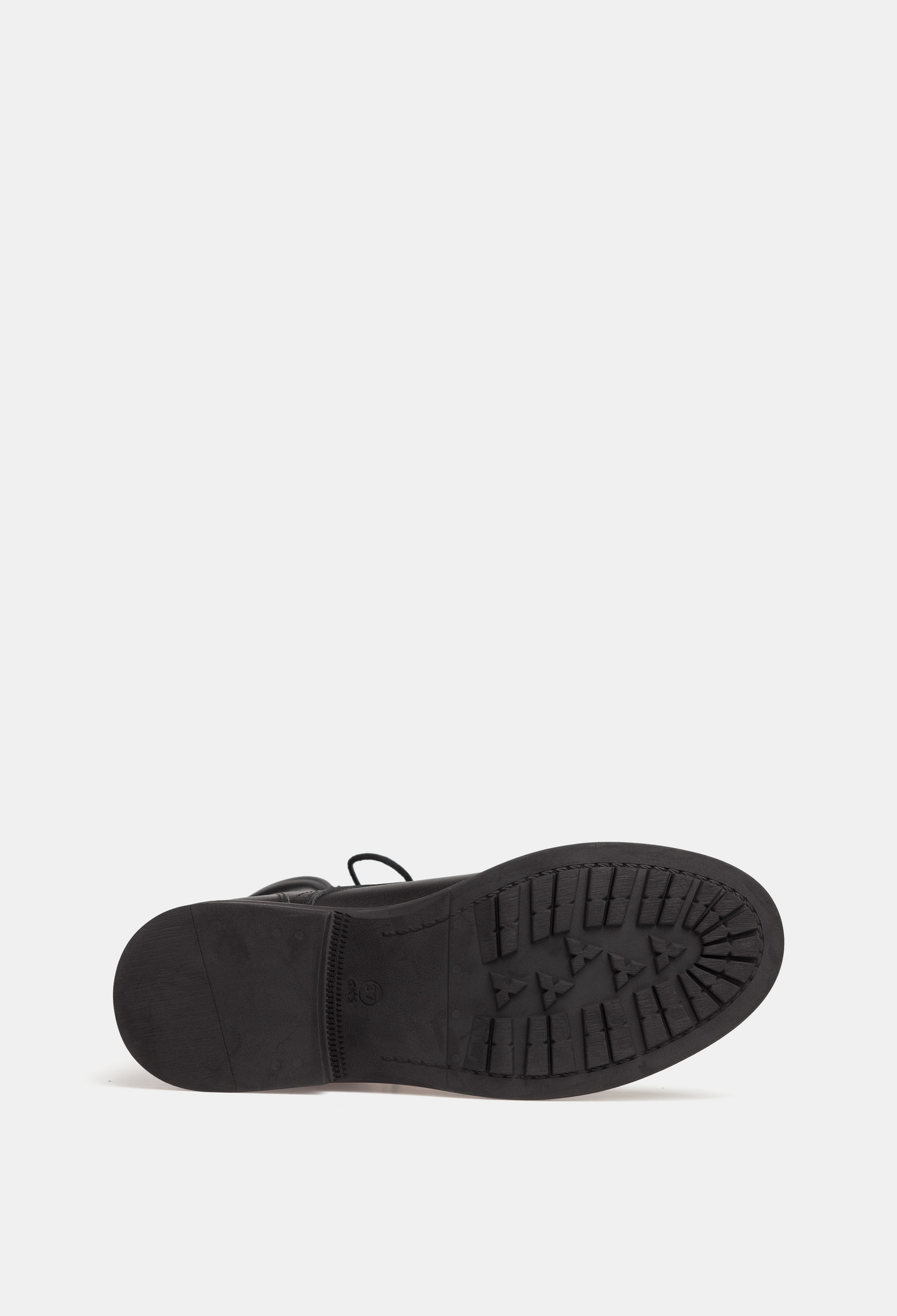 Лаконичные ботинки в чёрной гладкой коже. Модель является комфортным и практичным вариантом обуви на каждый день. Высокое голенище пары имеет классическую шнуровку для удобного надевания, а подошва оснащена аккуратным протектором для лучшего сцепления с поверхностями. Дополнительно пара утеплена мягкой подкладкой из текстиля. Обратите внимание, модель идёт в размер, но имеет зауженный силуэт.